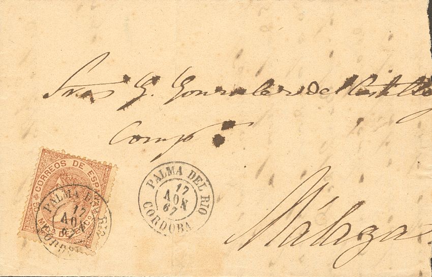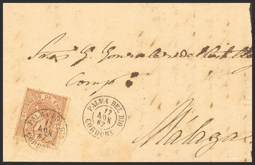 96. 1867. 50 mils chestnut. PALMA DEL RIO to MALAGA. Postmark PALMA DEL RIO / CORDOBA. MAGNIFICENT.