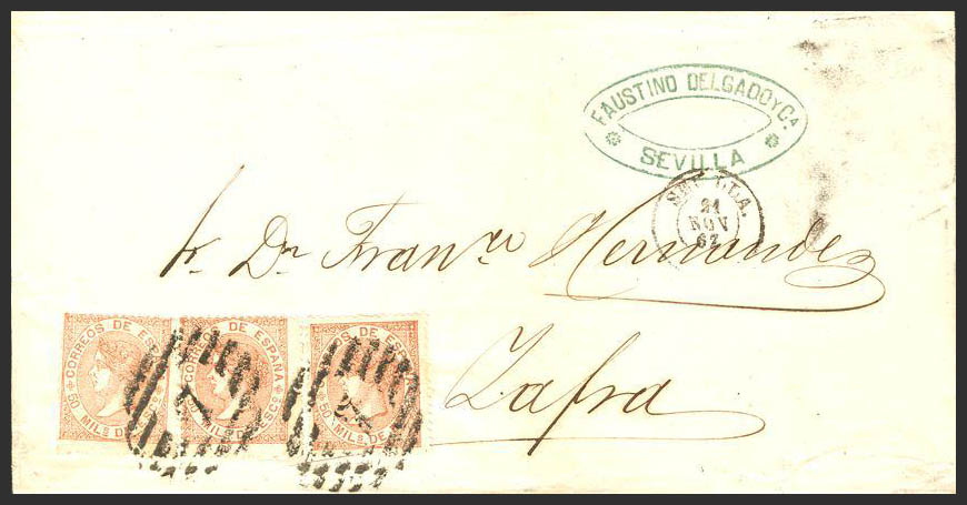 96(3). 1867. 50 mils chestnut, three stamps. SEVILLE to ZAFRA. Triple bearing. MAGNIFICENT.