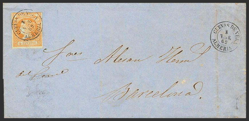 52. 1862. 4 orange cuartos . VERA CAVES to BARCELONA. Postmark CUEVAS DE VERA / ALMERIA. MAGNIFICENT.