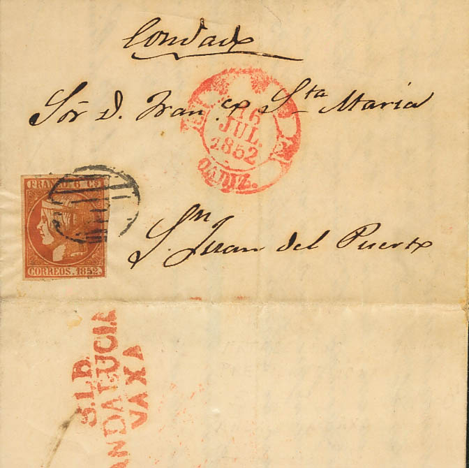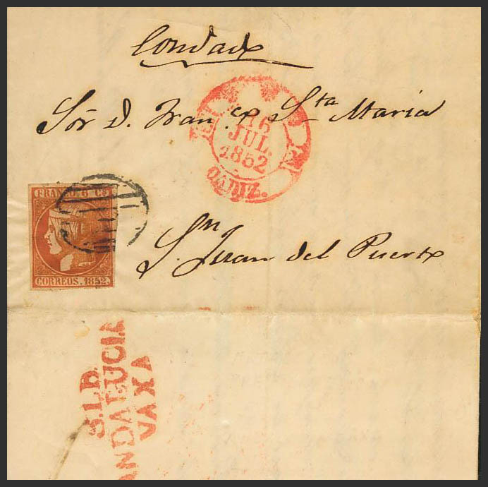 12. 1852. 6 cuartos pink. CADIZ to SAN JUAN DEL PUERTO. On the back pre-philatelic transit mark SLD / ANDALUCIA / VAXA. MAGNIFICENT.