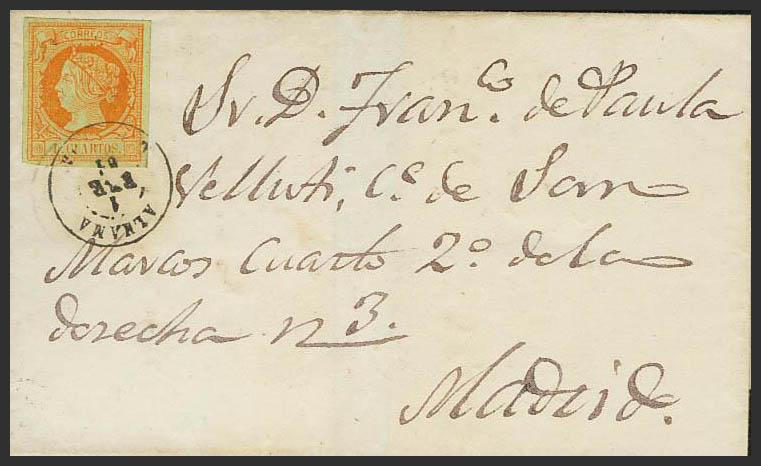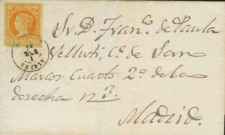 52. 1861. 4 cuartos yellow. ALHAMA to MADRID. Postmark ALHAMA / GRANADA. MAGNIFICENT AND EXTRAORDINARILY RARE.