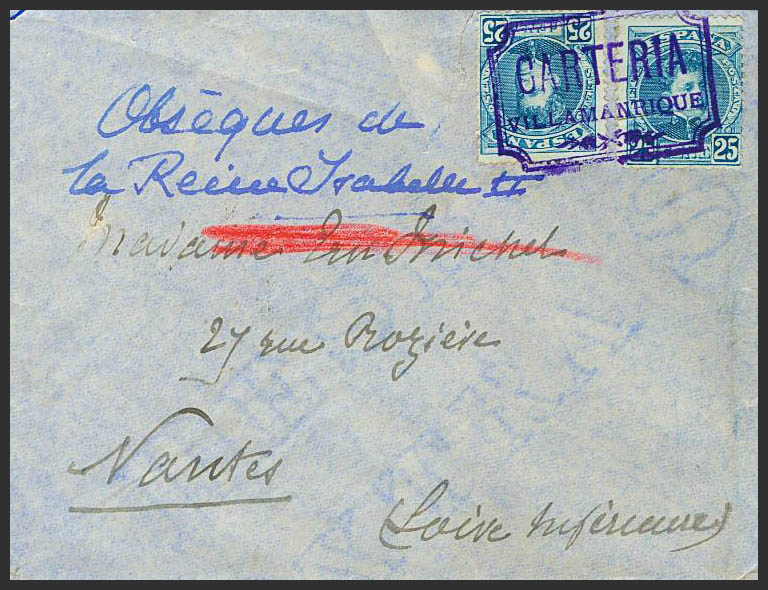 248(2). 1904. 25 blue cts, two stamps. VILLAMANRIQUE (SEVILLE) to NANTES (FRANCE). Special postmark CARTERIA / VILLAMANTIQUE. MAGNIFICENT AND RARE.