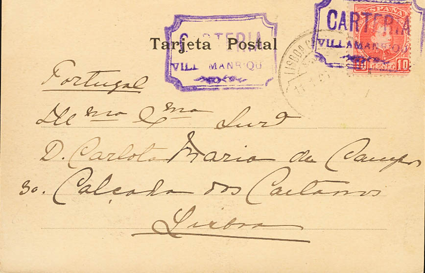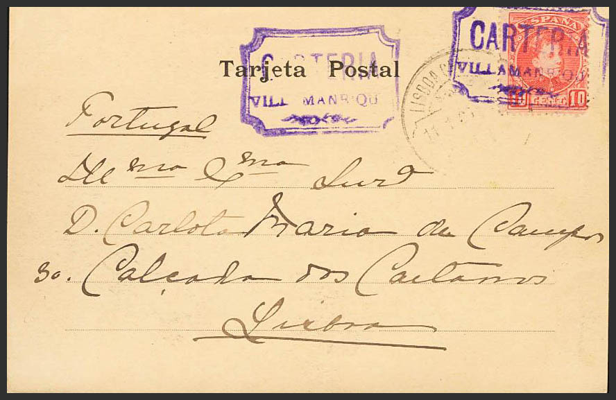 243. 1906. 10 cts red. Card from VILLAMANRIQUE (SEVILLA) to LISBON (PORTUGAL). Special postmark CARTERIA / VILLAMANRIQUE, in violet. MAGNIFICENT AND RARE.