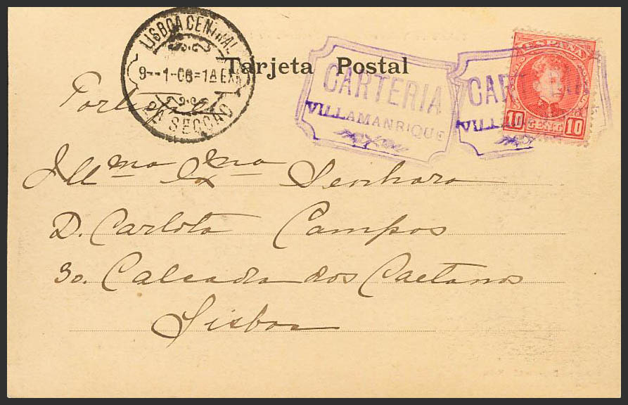243. 1906. 10 cts red. Card from VILLAMANRIQUE (SEVILLA) to LISBON (PORTUGAL). Special postmark CARTERIA / VILLAMANRIQUE, in violet. MAGNIFICENT AND RARE.