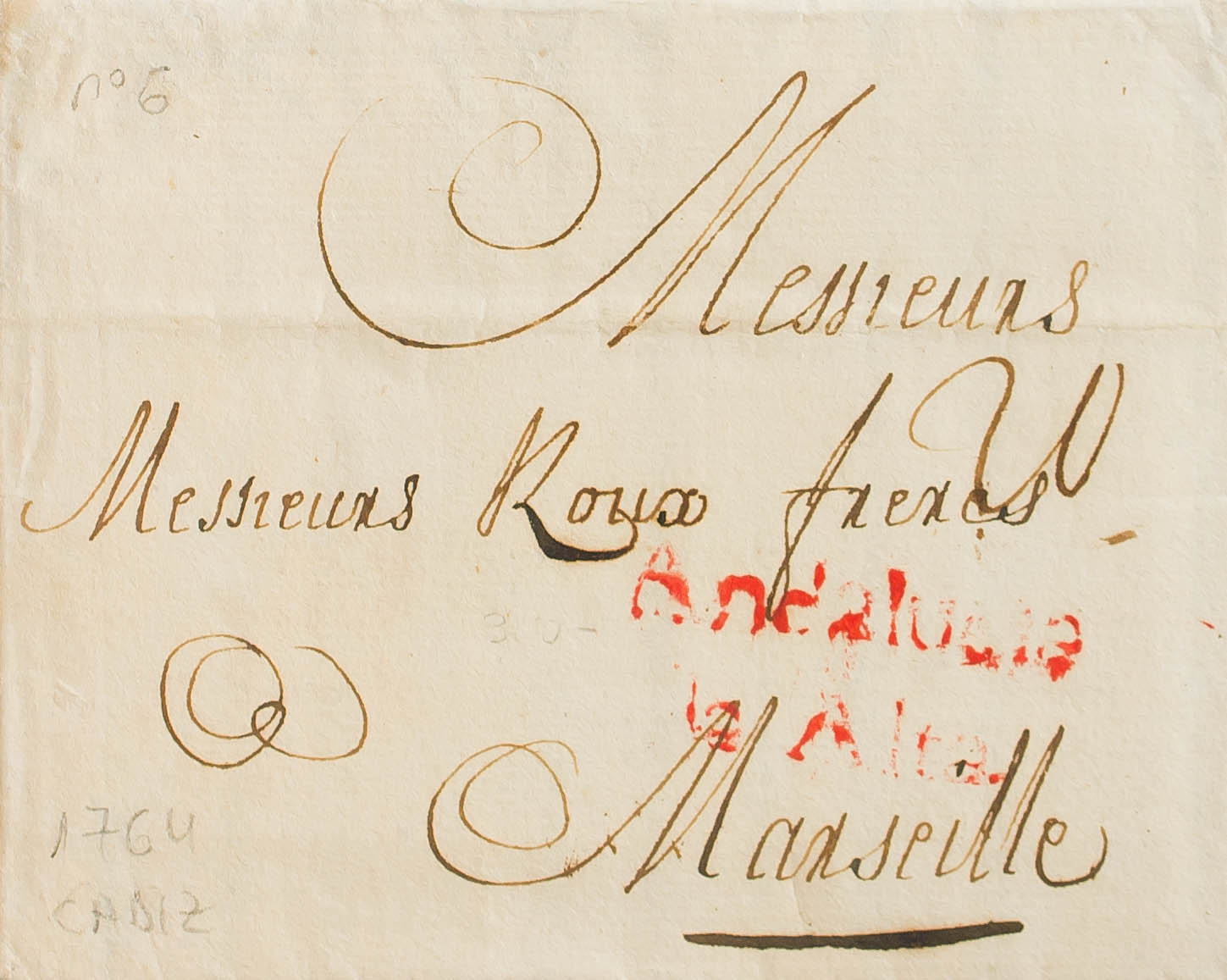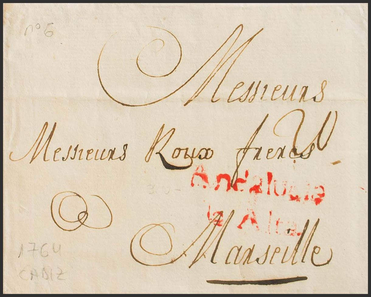 1764. CADIZ to MARSEILLE (FRANCE). ANDALUCIA / LA ALTA brand, in red (PE8) 2004 edition. MAGNIFICENT AND RARE.