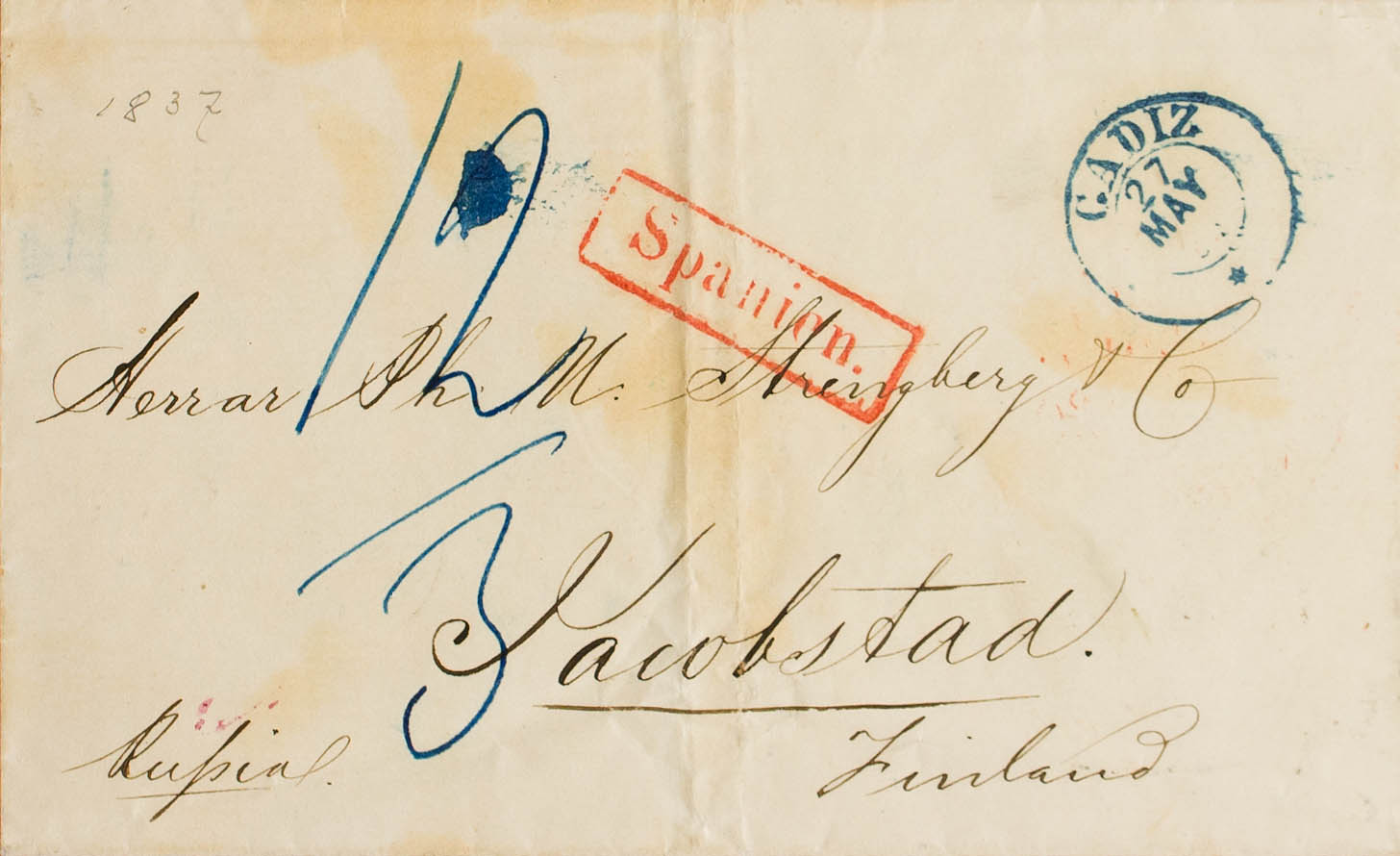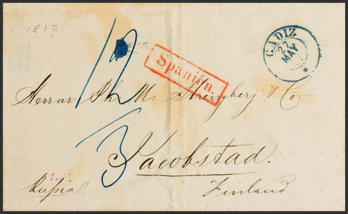 1857. CADIZ to JAKOBSTAD (FINLAND). Postmark * / CADIZ, in blue and SPANIEN mark and handwritten postage 12/3. MAGNIFICENT AND VERY RARE DESTINATION.