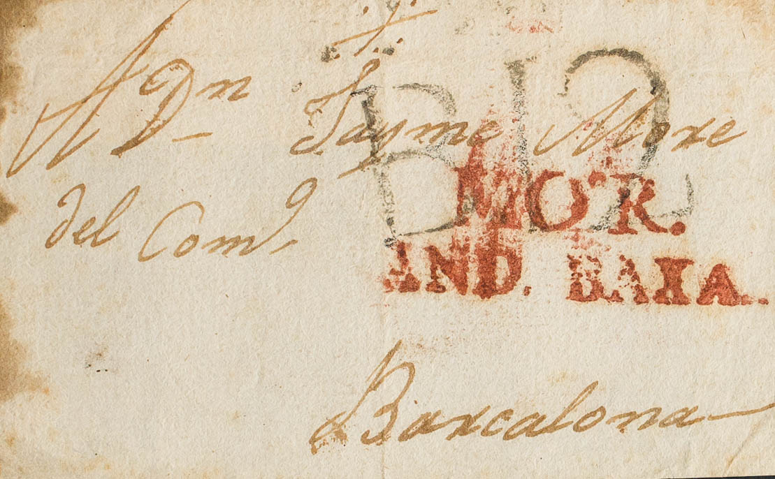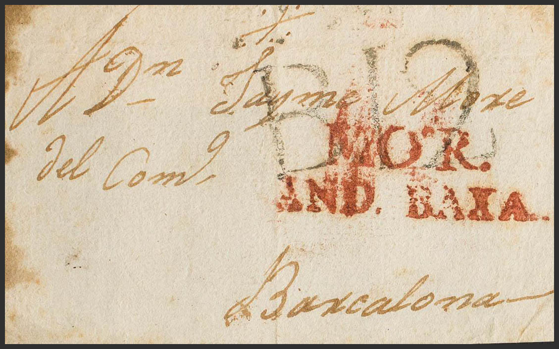 (1804ca). Front from MOTRIL to BARCELONA. MOR brand. /AND. BAXA, in Motril red (PE2) 2004 edition. MAGNIFICENT AND VERY RARE, THIS BRAND WAS ONLY APPLIED FOR ONE YEAR.