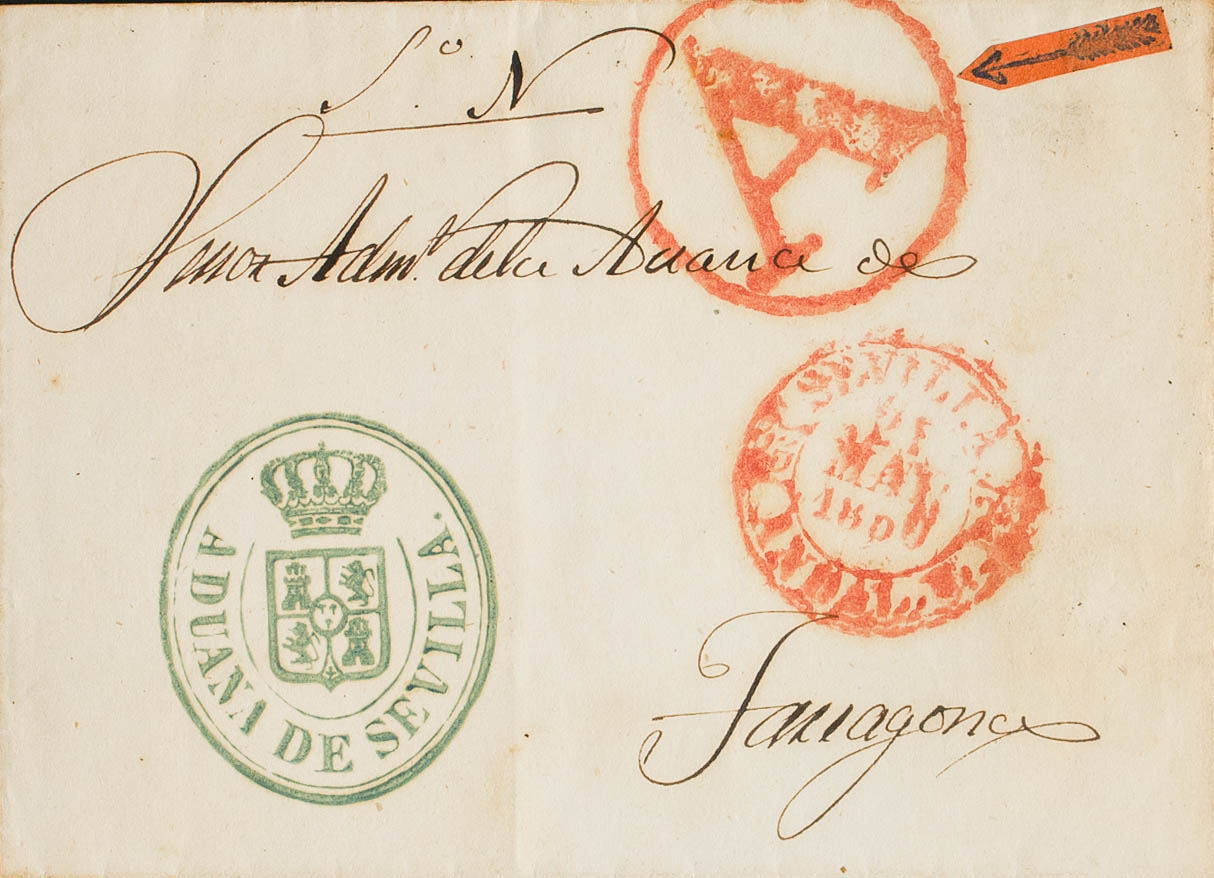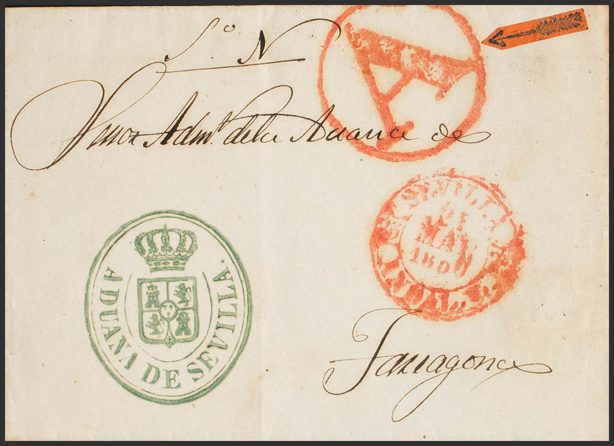 1850. SEVILLE to TARRAGONA. Mark "A", in fertilizer red (PE42) 2004 edition. MAGNIFICENT STAMPING.