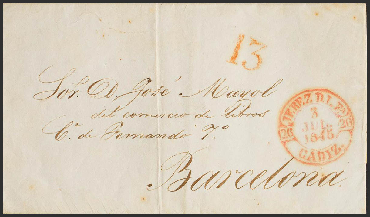 1845. JEREZ DE LA FRONTERA to BARCELONA. Baeza JEREZ DLFª / CADIZ, in red. MAGNIFICENT.