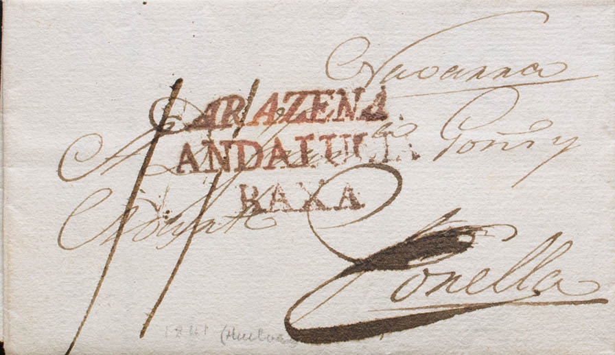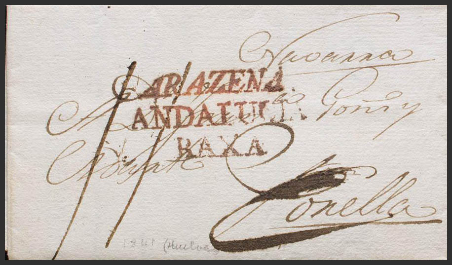(1814ca). ARACENA (HUELVA) to CORELLA (NAVARRA). ARAZENA / ANDALUCIA / BAXA brand, in red (PE3) 2004 edition. MAGNIFICENT AND SPECTACULAR STAMPING.