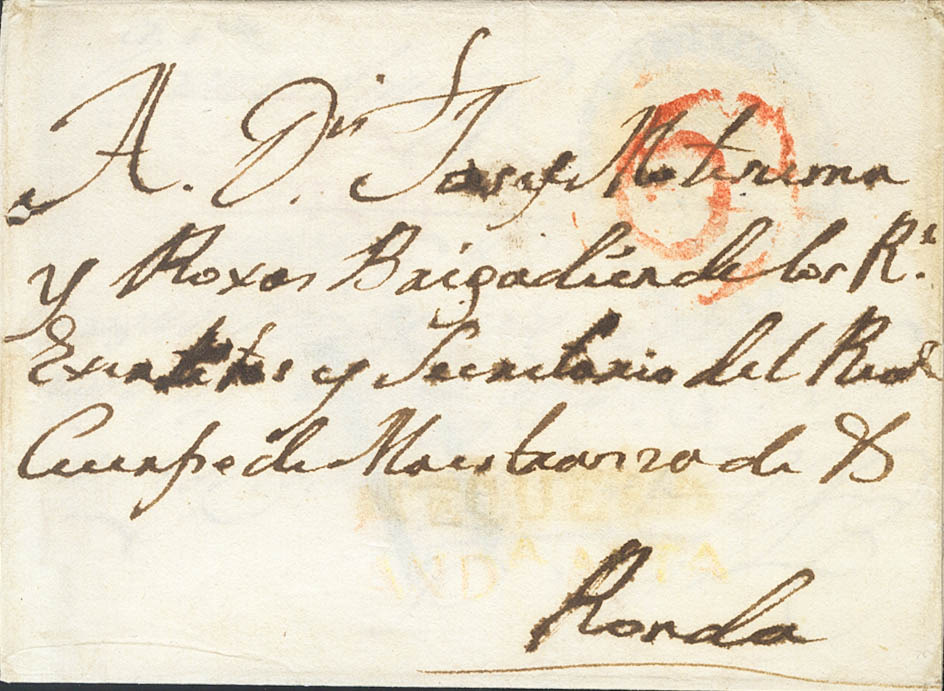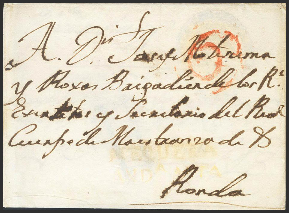 (1799ca). ANTEQUERA to RONDA, and reused from RONDA to PAMPLONA with the MAESTRANZA DE CABALLERIA DE RONDA franchise brand. Brand ANTEQUERA / ANDA.ALTA, in red (PE2) (weak stamping) 2004 edition. MAGNIFICENT AND EXTREMELY RARE.