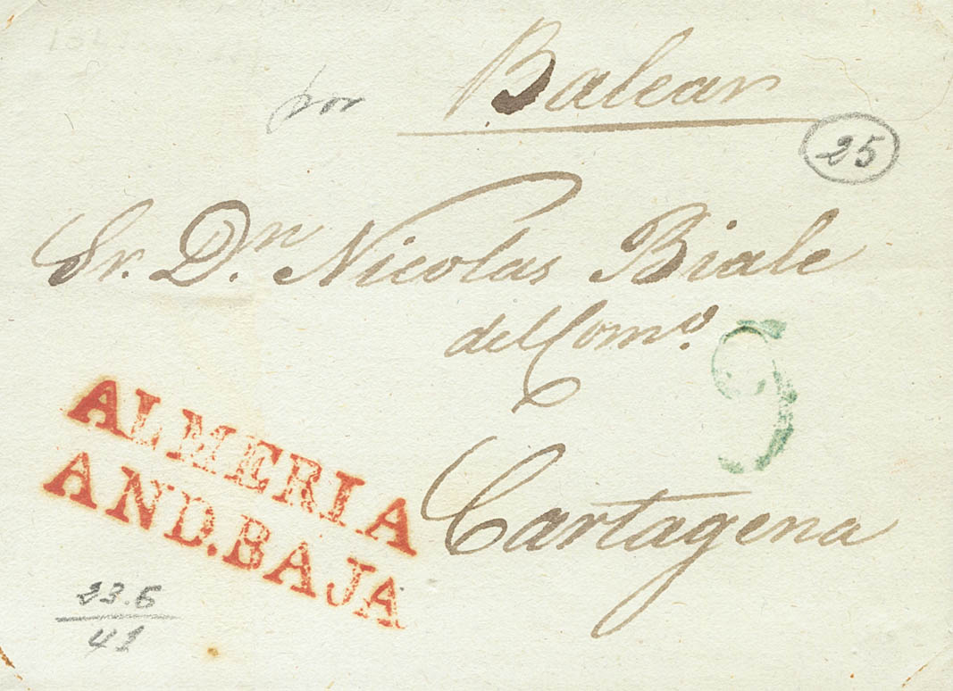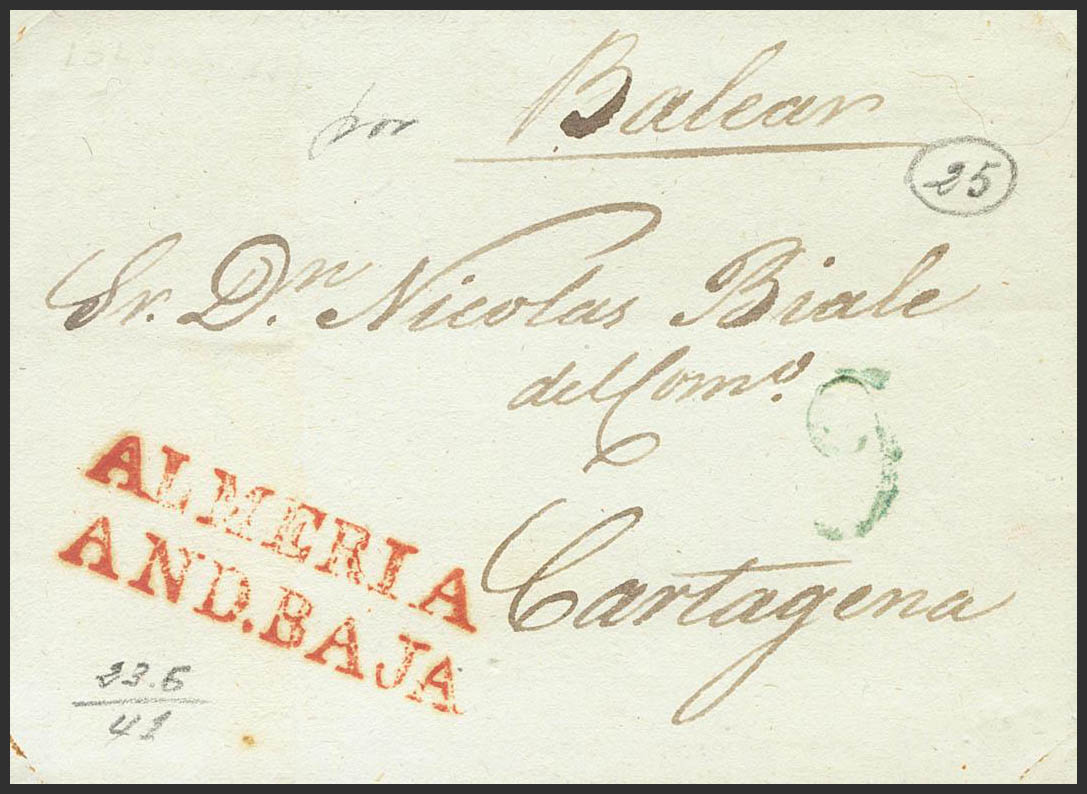 1841. ALMERIA to CARTAGENA. ALMERIA / AND brand. LOW, in red (PE7) 2004 edition and manuscript "Por Balear" (Paddle steamer that covered the Barcelona-Cádiz line). MAGNIFICENT PRINT.