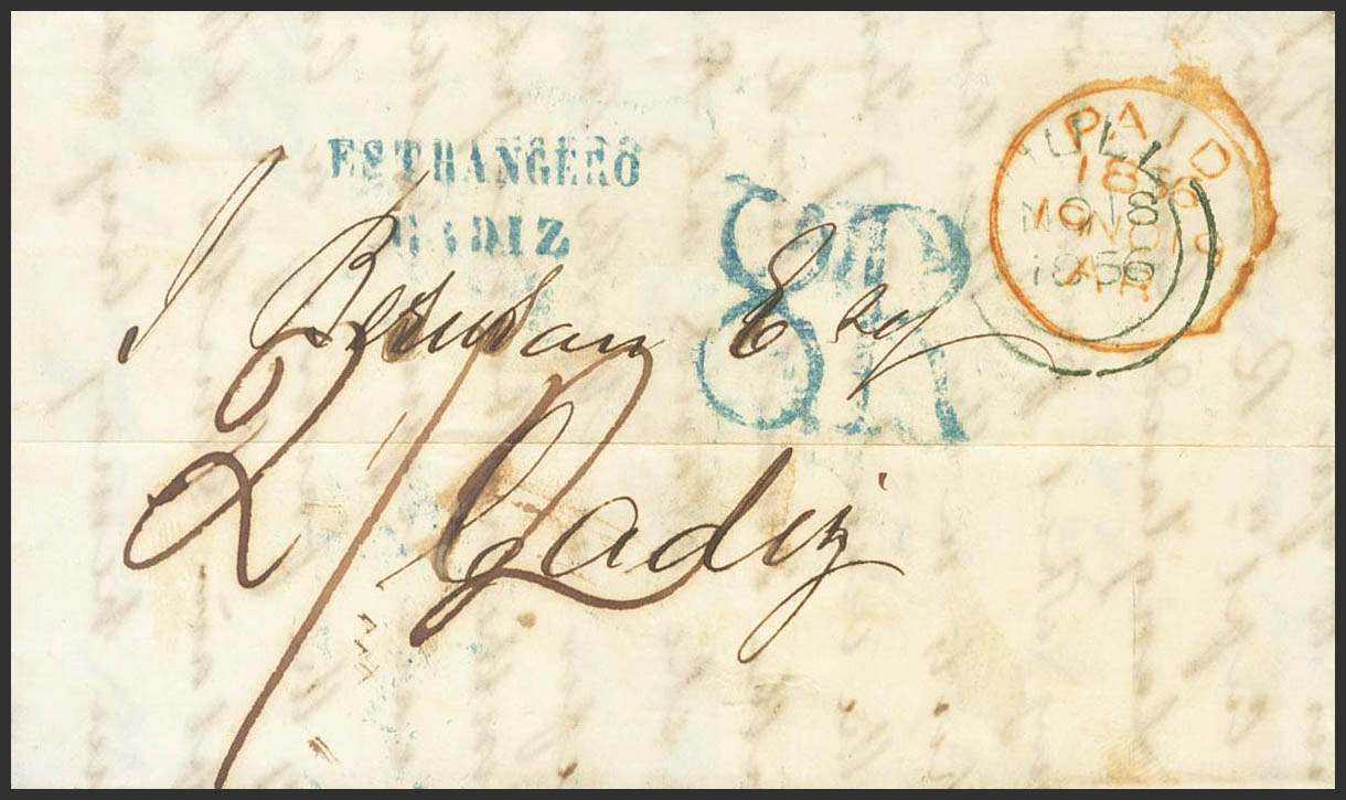 1854. Set of two letters from GREAT BRITAIN to CADIZ, both with the ESTRANGERO / CADIZ mark, in black and blue (PE74) 2004 edition, respectively and with different portages. MAGNIFICENT AND RARE.