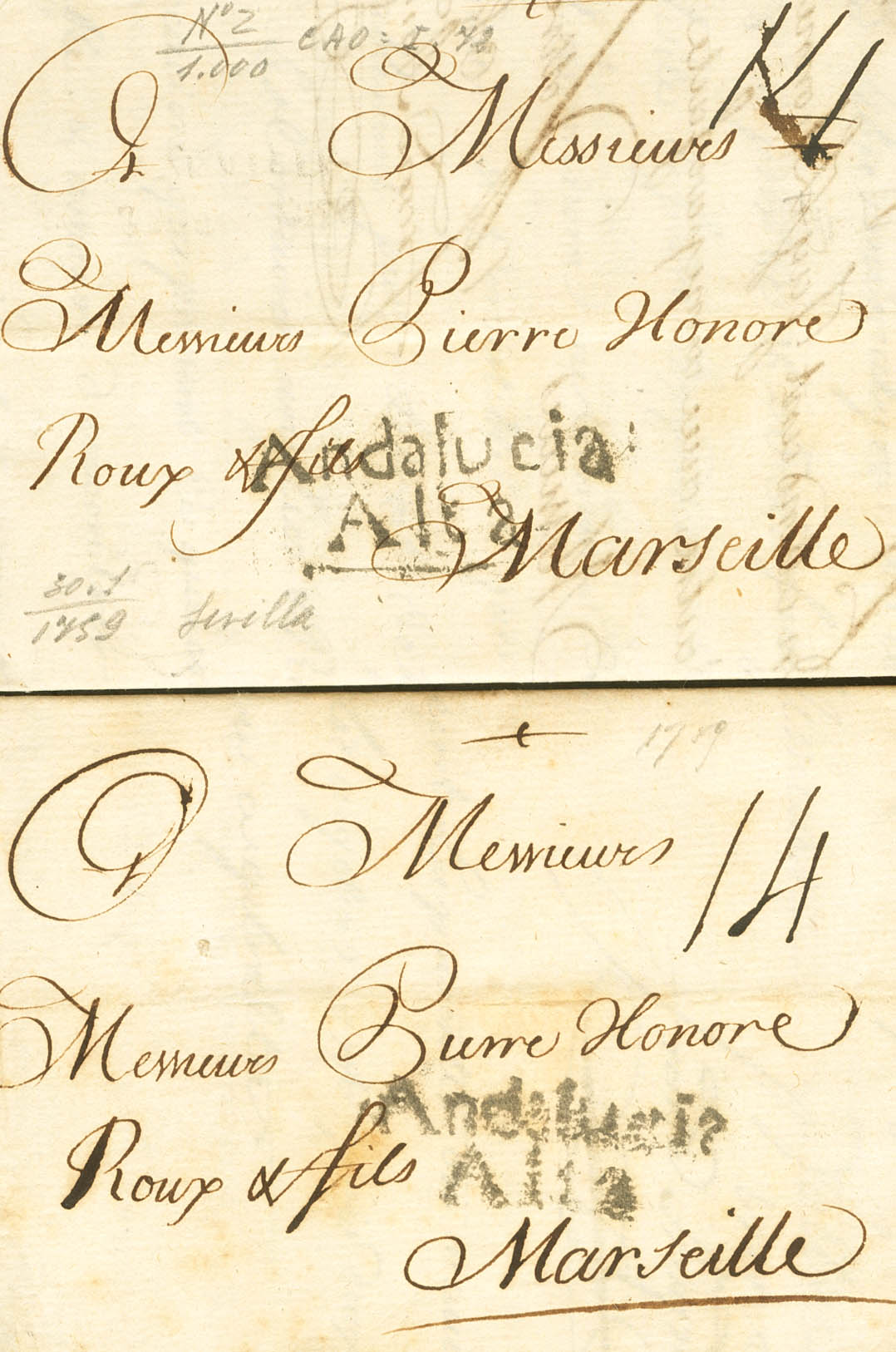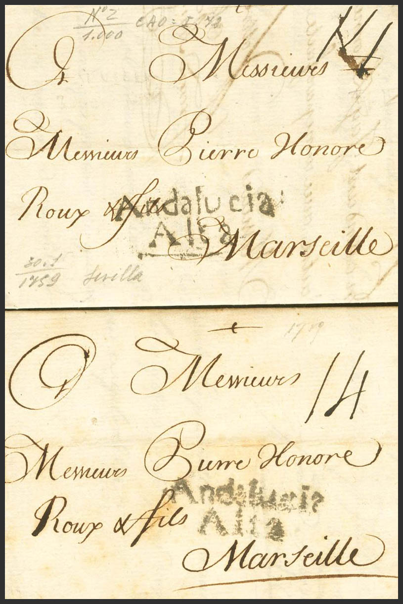 1759. Two letters from SEVILLE to MARSEILLE (FRANCE), both with the ANDALUCIA / ALTA mark, in black (PE5) 2004 edition. MAGNIFICENT.