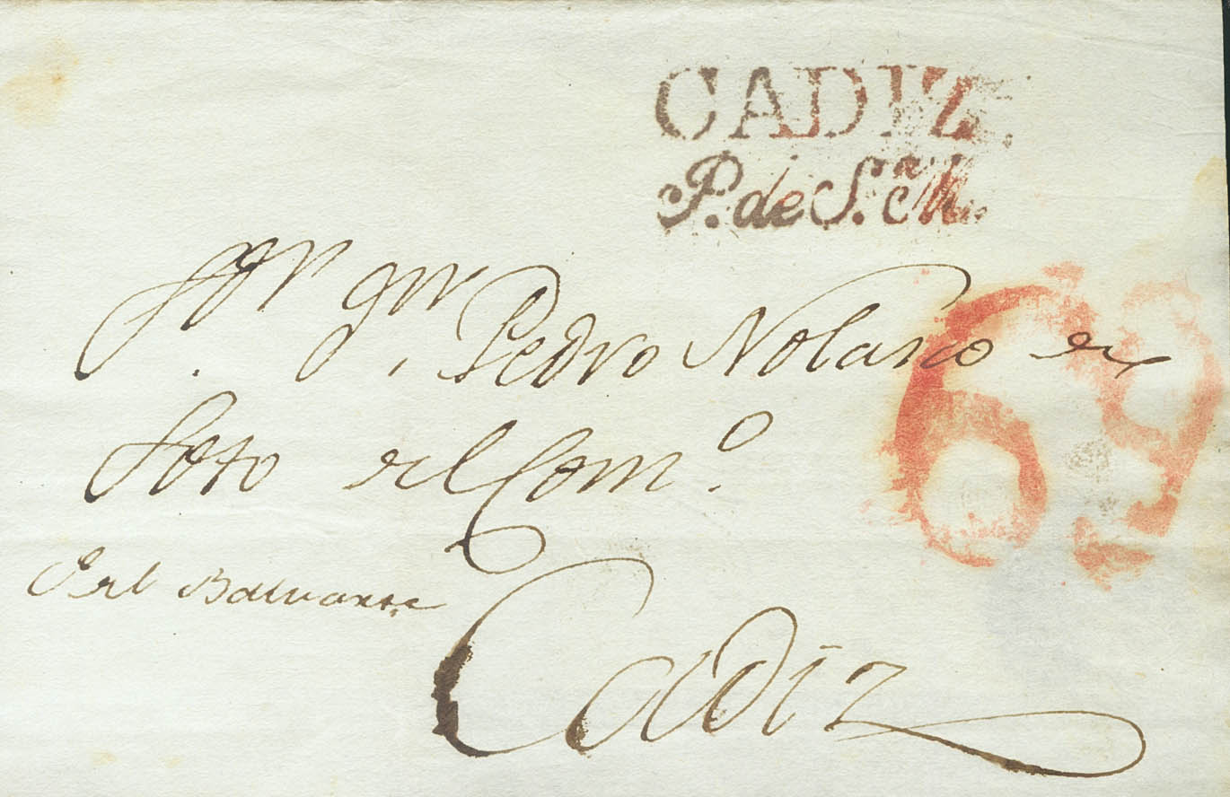 English (1832ca). PORT OF SANTA MARIA to CADIZ. CADIZ / P.DE Sª.M. brand, in red (PE6) 2004 edition. MAGNIFICENT.