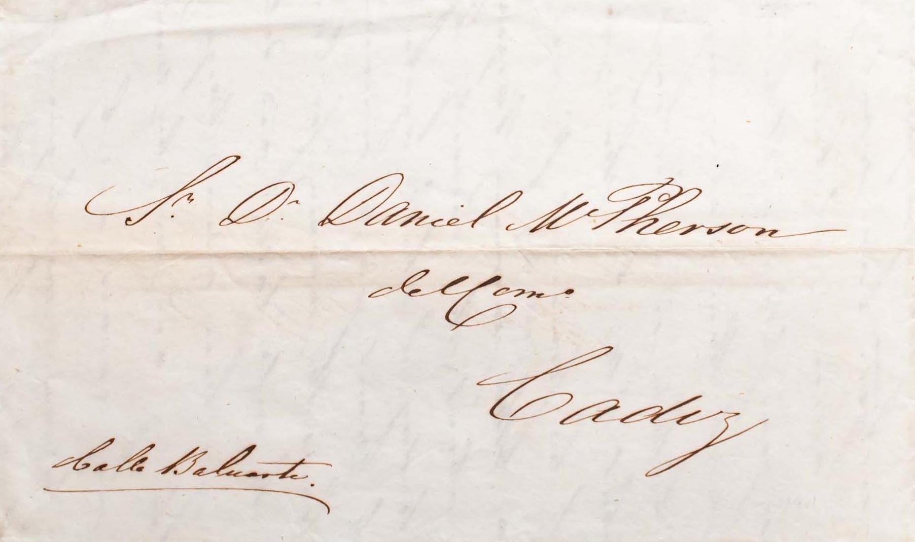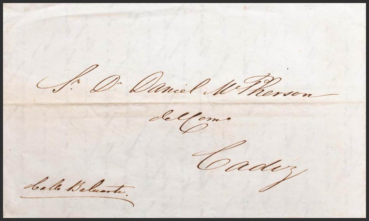 1843. SANLUCAR DE BARRAMEDA to CADIZ, privately circulated with handwritten annotation "Calle Baluarte". MAGNIFICENT.