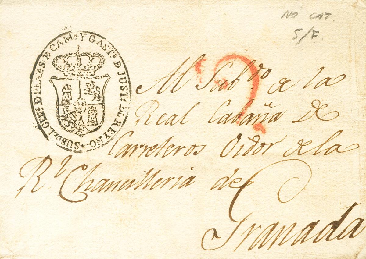 |ABOUT|(1830ca). Addressed to GRANADA. Oval mark SUBDEL. GENERAL. OF PENALTIES OF CAMª AND GASTS OF JUSTª DEL REYNO, in black. MAGNIFICENT AND RARE.