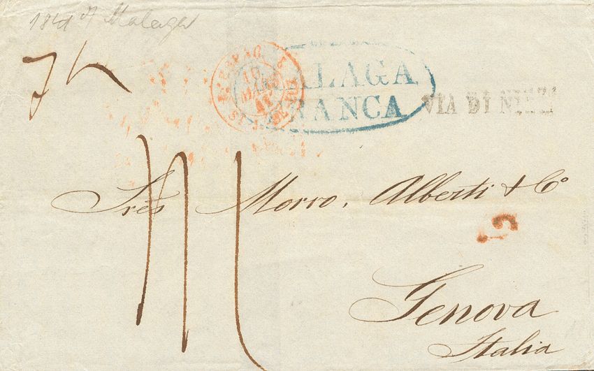 1841. MALAGA to ITALY. MALAGA / FRANCA brand, in blue (PE 21). Edition 2004. MAGNIFICENT.