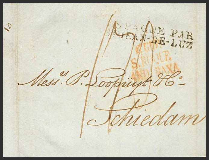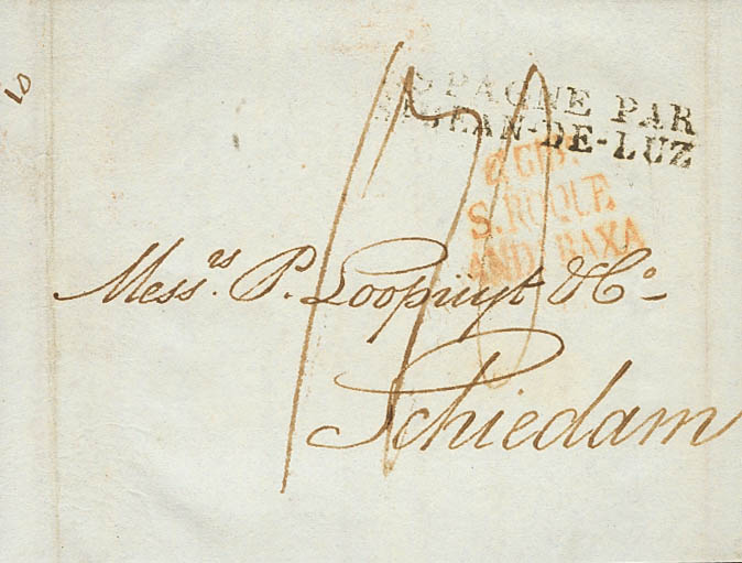 English 1829. GIBRALTAR to SCHIEDAM (NETHERLANDS). GIB mark. / S. ROQUE / ANDª. BAXA, in red (PE10) 2004 edition. MAGNIFICENT AND UNUSUAL DESTINATION.