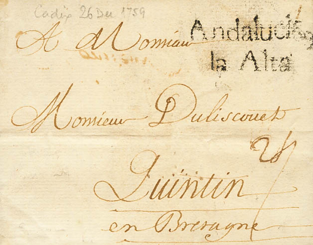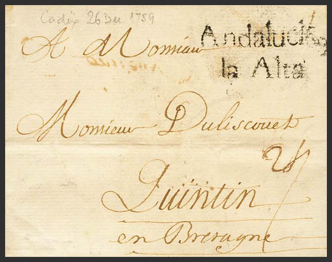 1759. CADIZ to QUINTIN (FRANCE). ANDALUCIA / LA ALTA brand, in black (PE7) 2004 edition. MAGNIFICENT.