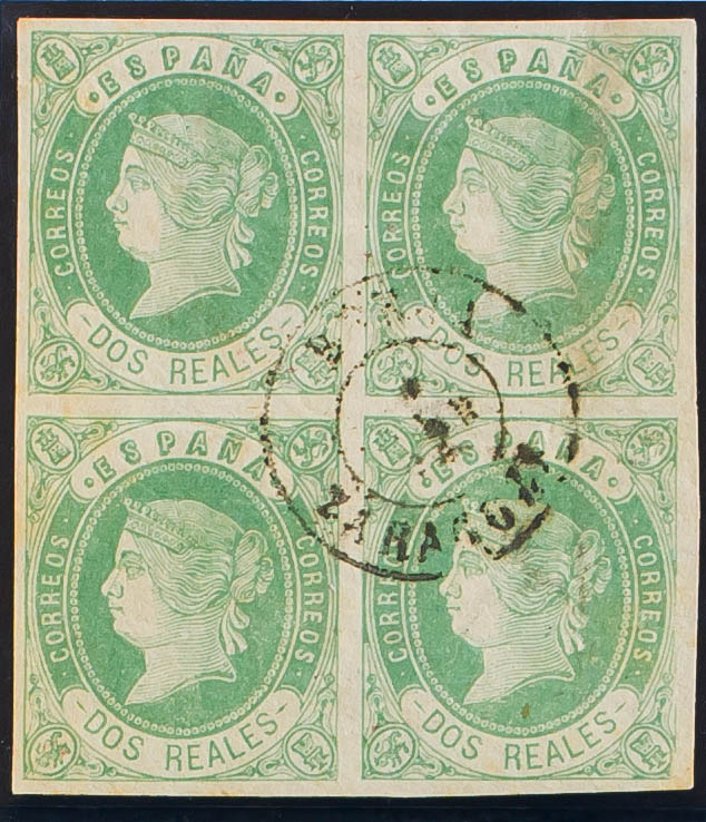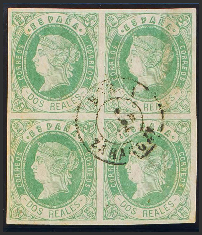 English 62(4). 1862. 2 reales green, block of four. Postmark BORJA / ZARAGOZA. MAGNIFICENT.