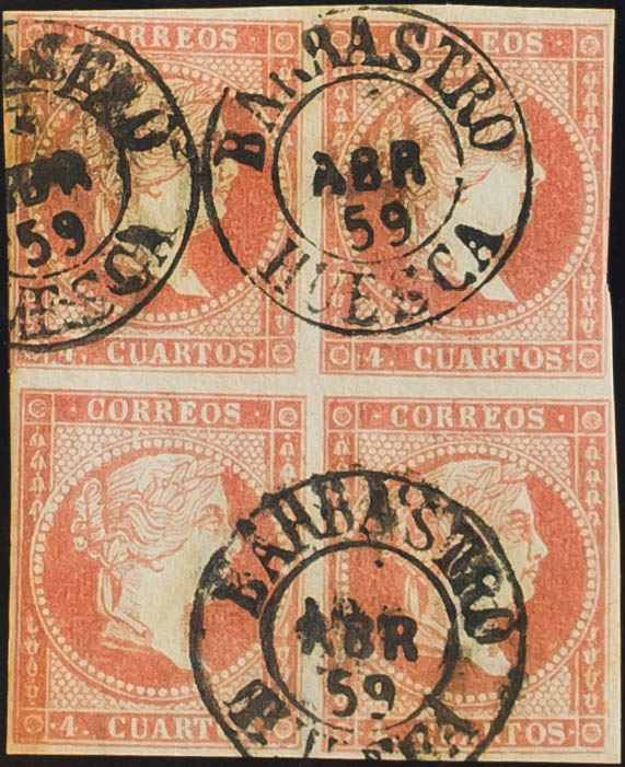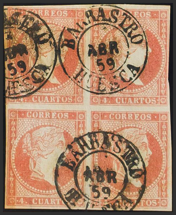 English 48(4). 1856. 4 red cuartos , block of four. Postmark BARBASTRO / HUESCA (Type I). MAGNIFICENT.