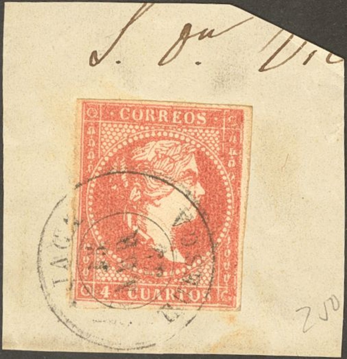 English △ 48. 1856. 4 red cuartos , on fragment. Postmark JACA / HUESCA. MAGNIFICENT.