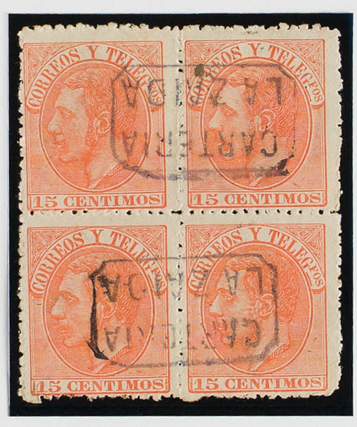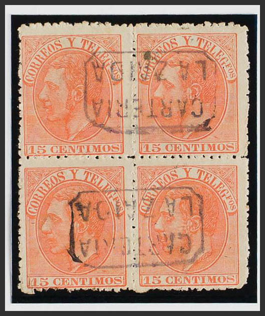 210(4). 1882. 15 orange cts, block of four. Postmark CARTERIA / LA ZAIDA, from Zaragoza. MAGNIFICENT AND RARE.