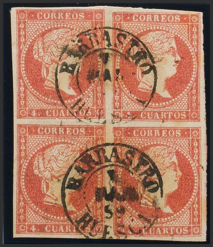 English 48(4). 1856. 4 red cuartos , block of four. Postmark BARBASTRO / HUESCA (Type I). MAGNIFICENT.