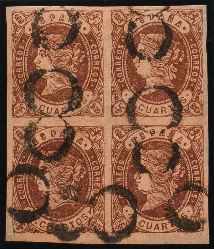58(4). 1862. 4 chestnut cuartos , block of four. Portage postmark "8", from Borja. MAGNIFICENT AND VERY RARE. Certificate GRAUS.