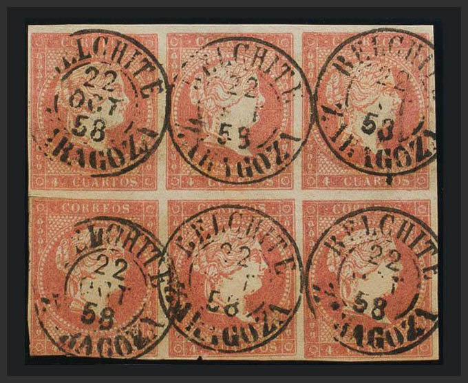 48(6). 1855. 4 red cuartos , block of six. Postmark BELCHITE / ZARAGOZA (Type I). MAGNIFICENT.
