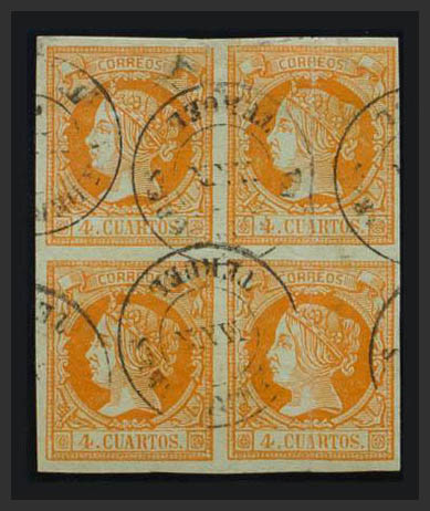 52(4). 1860. 4 orange cuartos , block of four. Postmark VALDERROBRES / TERUEL. MAGNIFICENT AND VERY RARE, ACCORDING TO LAIZ IT IS THE RAREEST TYPE II DATER IN THE PROVINCE OF TERUEL.