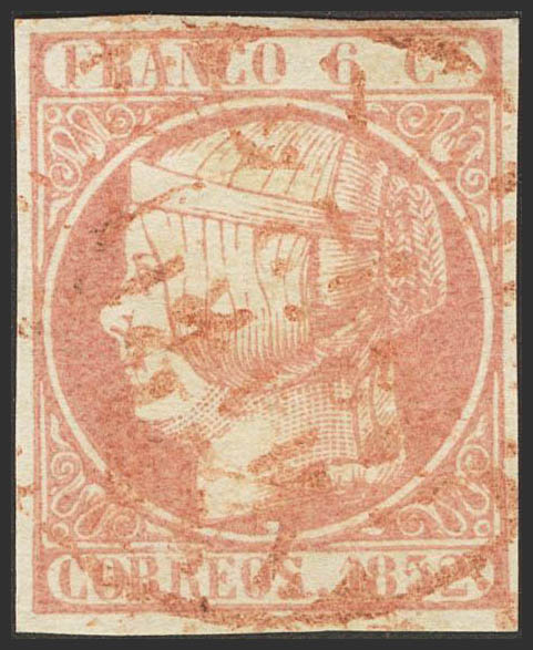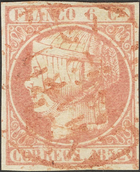 12. 1852. 6 pink cuartos . Baeza ZARAGOZA / ARAGON postmark, in red. MAGNIFICENT AND VERY RARE, VERY SPECTACULAR. Ex-Germany.