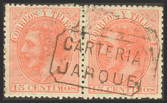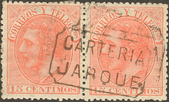210(2). 1882. 15 cts orange, pair. Postmark CARTERIA / JARQUE. MAGNIFICENT.