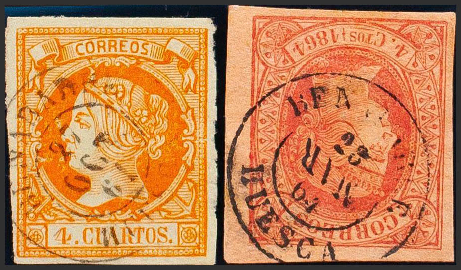 52, 64. (1860ca). Set of two stamps of 4 cuartos yellow and 4 cuartos pink, unused with BENABARRE / HUESCA postmark. MAGNIFICENT.