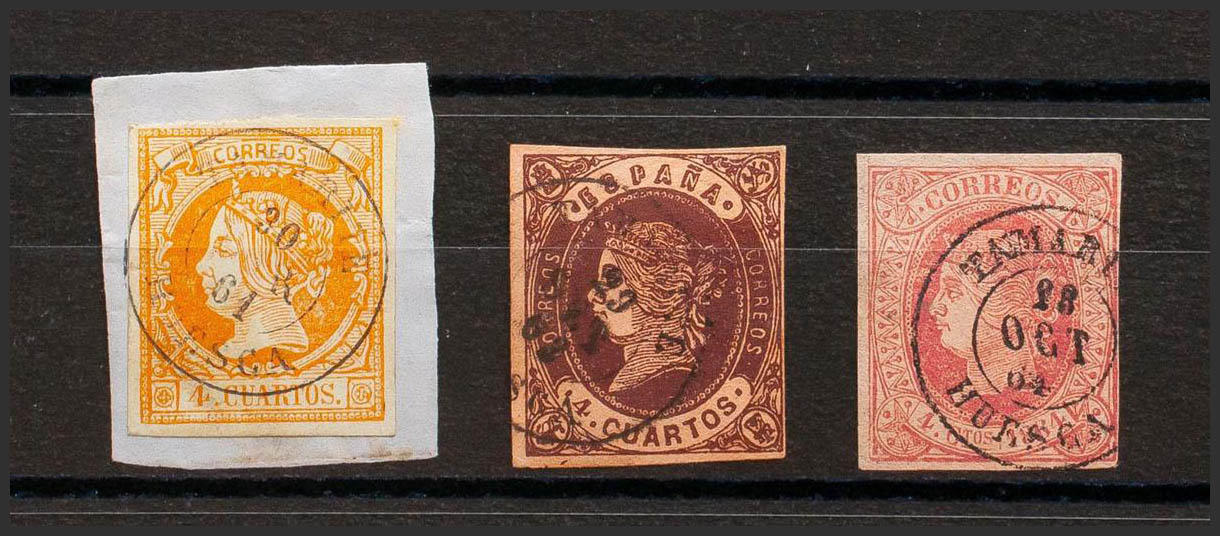 52, 58, 64. (1860ca). Set of three 4- cuartos yellow, brown and pink stamps, unused with TAMARITE / HUESCA postmark. MAGNIFICENT.