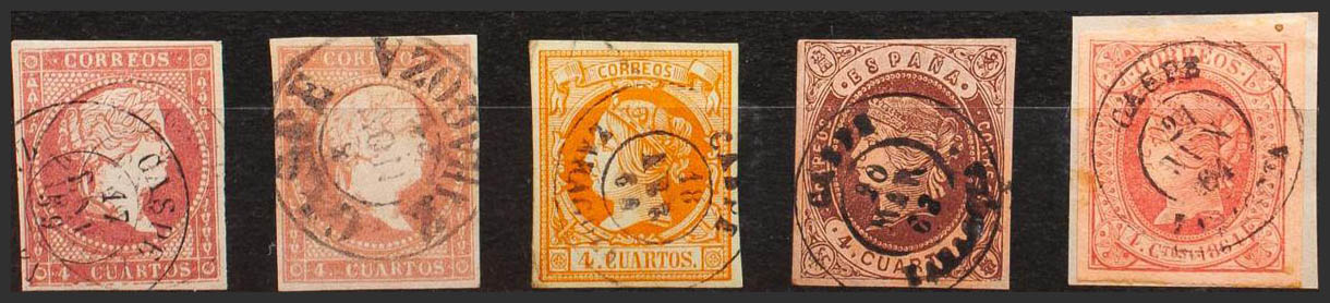 48(2), 52, 58, 64. (1855ca). Set of five 4- cuartos red, yellow, brown and pink stamps, unused with the CASPE / ZARAGOZA postmark (including Type I on the 4- cuartos red). MAGNIFICENT.