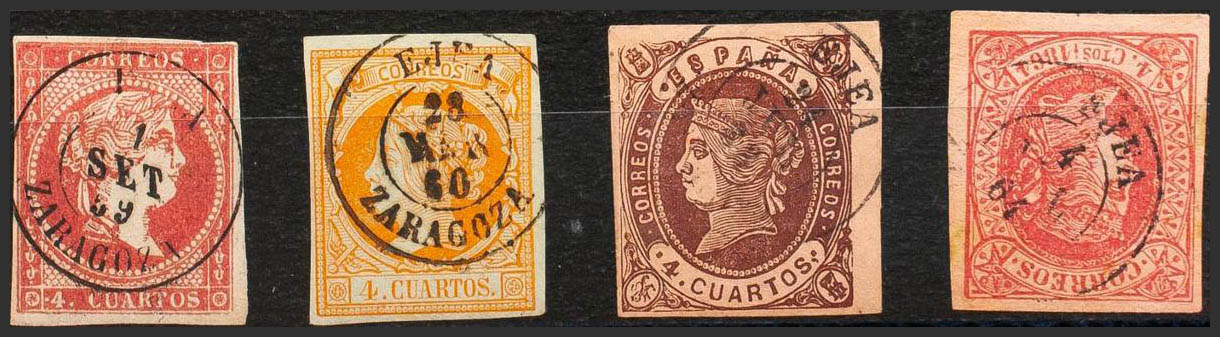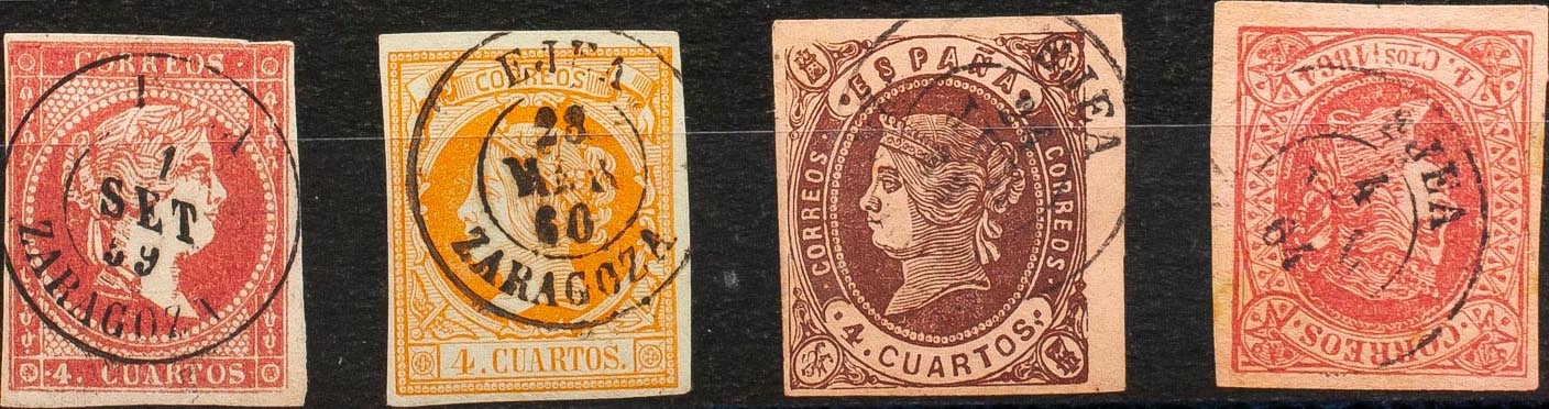 48, 52, 58, 64. (1855ca). Set of four 4- cuartos stamps red, yellow, brown and pink, unused with EJEA / ZARAGOZA postmark. MAGNIFICENT.