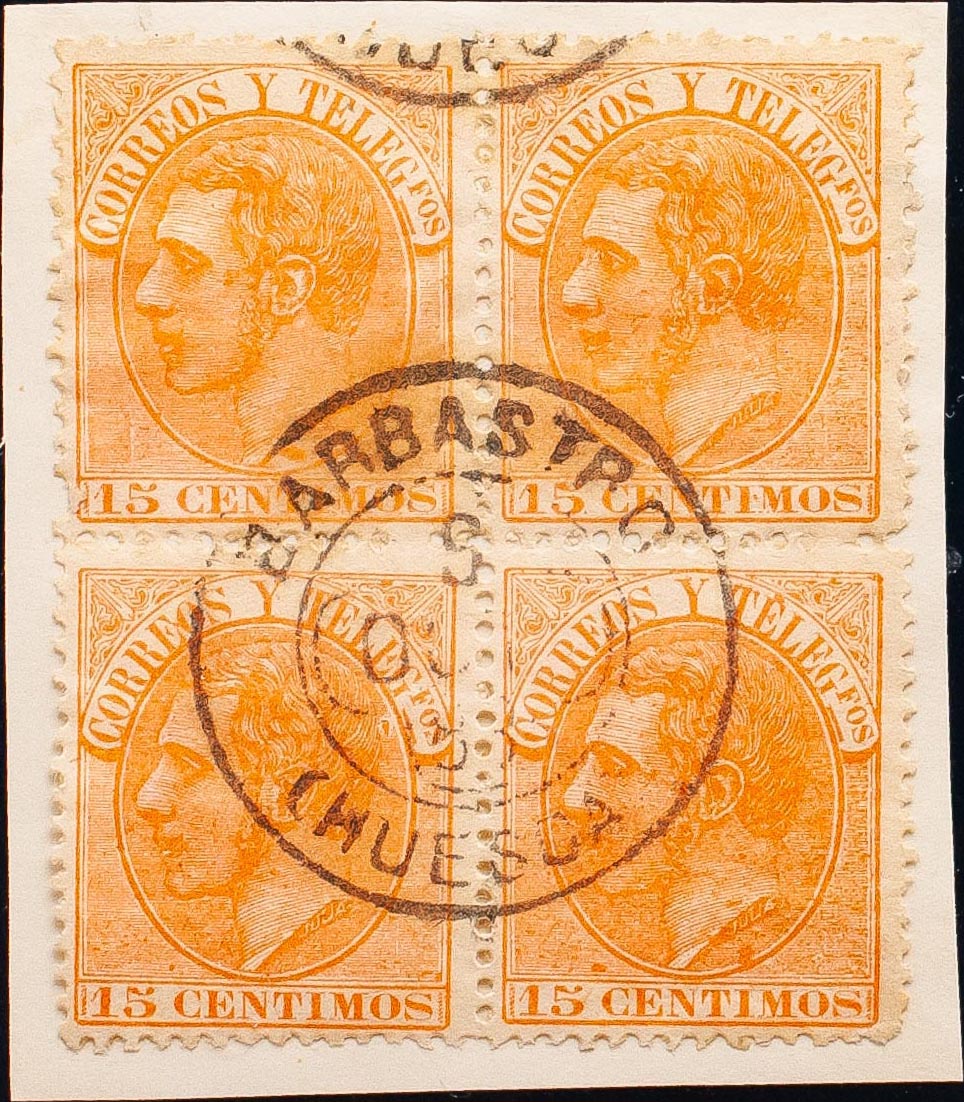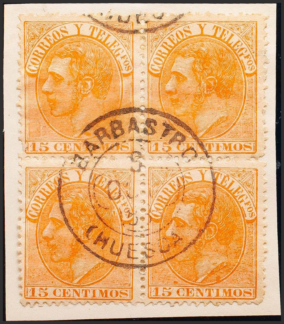 210(4). 1882. 10 cts orange, block of four. BARBASTRO clover postmark / (HUESCA). MAGNIFICENT.