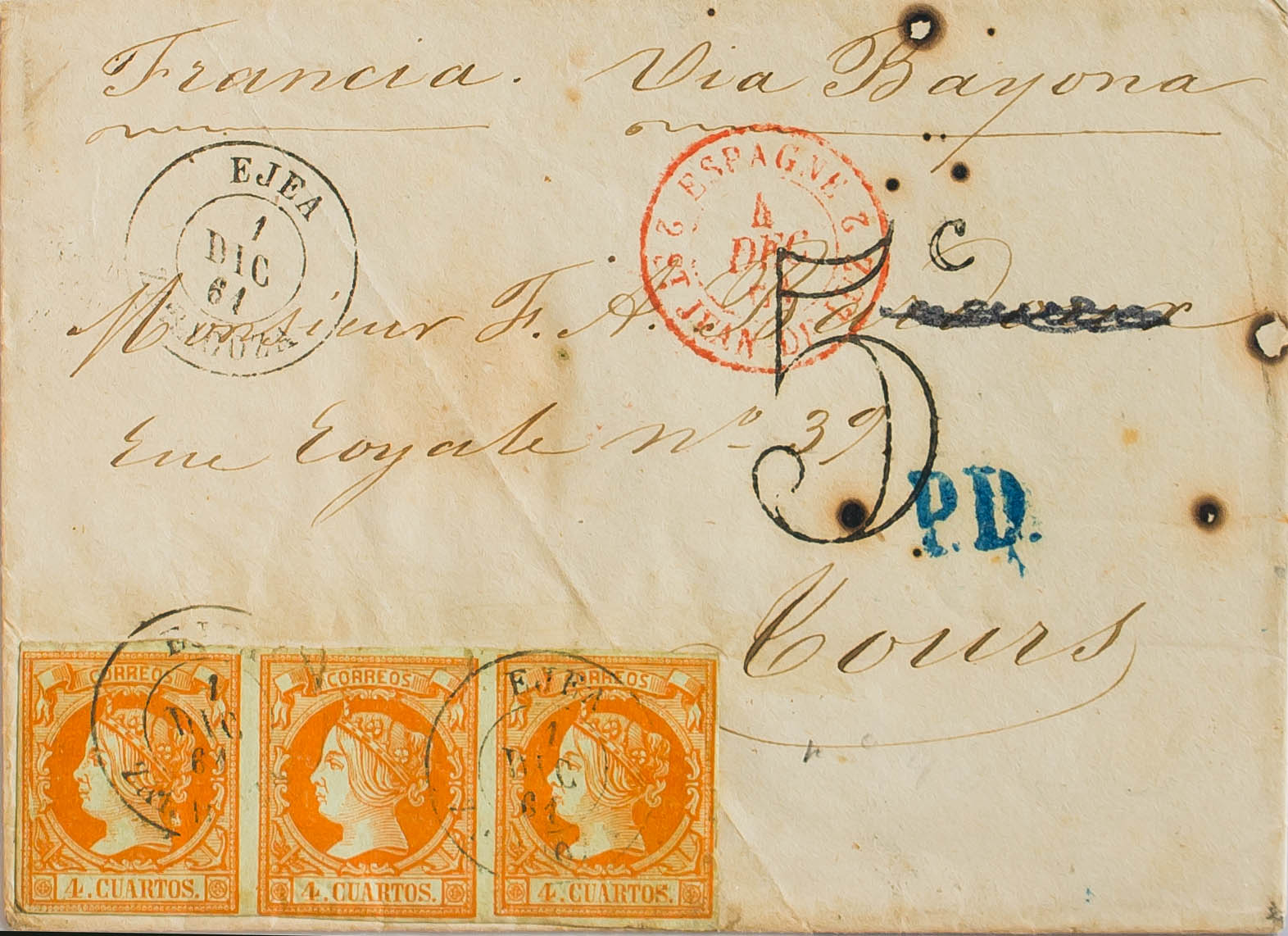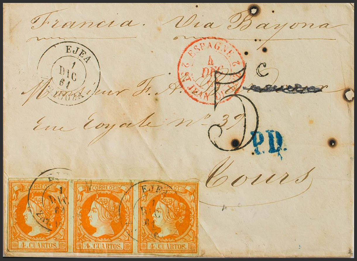 52(3). 1861. 4 yellow cuartos , strip of three. EJEA (ZARAGOZA) to TOURS (FRANCE). Postmark EJEA / ZARAGOZA. MAGNIFICENT AND UNUSUAL COMPOSITION TO GET THE RATE OF 12 ROOMS TO FRANCE.