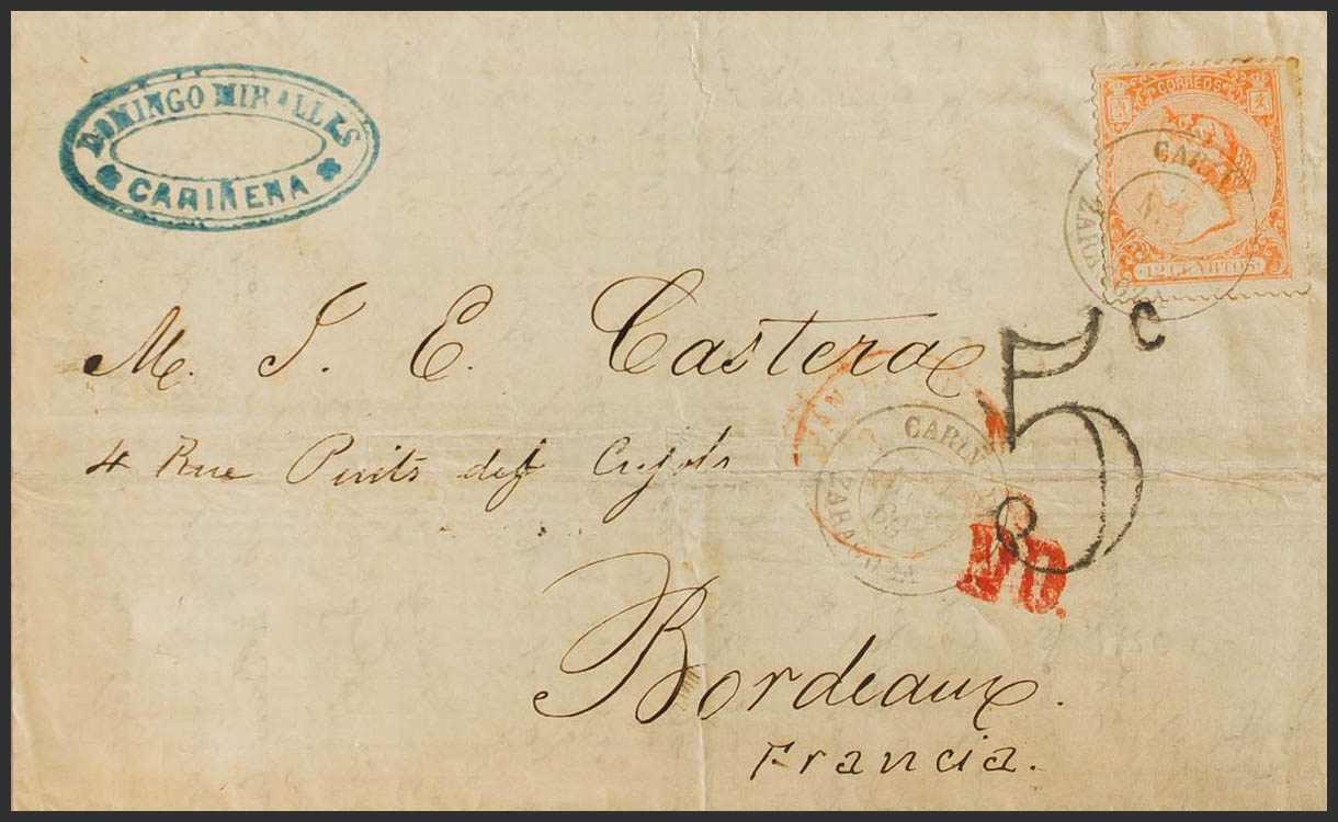 82. 1866. 12 orange cuartos . CARIÑENA to BORDEAUX (FRANCE). Postmark CARIÑENA / ZARAGOZA. MAGNIFICENT.