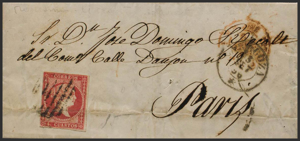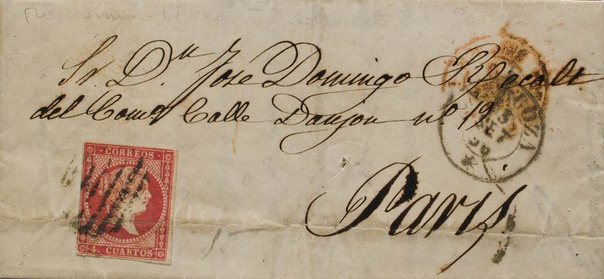 48. 1856. 4 red cuartos (archive fold). ZARAGOZA to PARIS (FRANCE). Postmark GRILL and on the front dater * / ZARAGOZA (Type I) and handwritten rate "5", according to the agreement with France of April 1849, postage to the border was only necessary. MAGNIFICENT AND RARE.