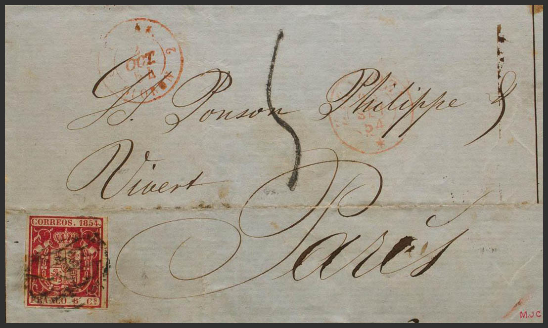 24. 1854. 6 carmine cuartos . ZARAGOZA to PARIS (FRANCE). In the French portage front "5", according to the Postal Agreement with France, the prior postage of ordinary correspondence was not necessary. MAGNIFICENT AND VERY RARE.