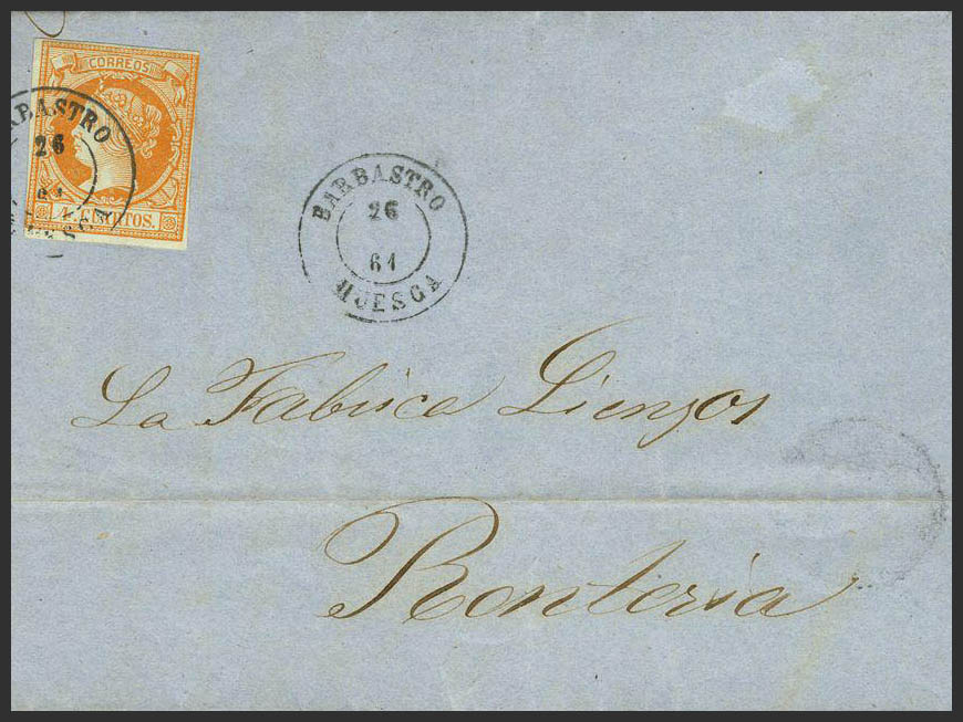 English 52. 1861. 4 cuartos yellow. BASBASTRO to RENTERIA. Postmark BARBASTRO / HUESCA.
