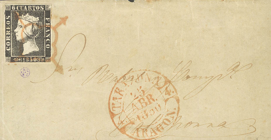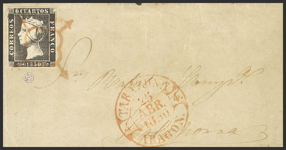 1A. 1850. 6 cuartos black. Front from TARAZONA (ZARAGOZA) to CALAHORRA. SPIDER postmark, in red. MAGNIFICENT AND RARE.