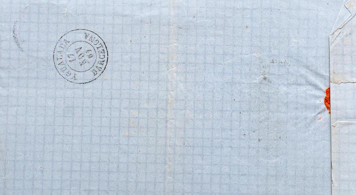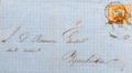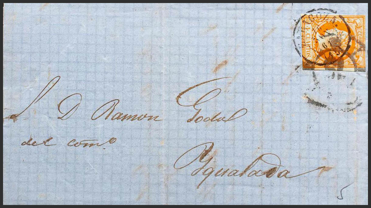 52. 1861. 4 orange cuartos . ZARAGOZA to IGUALADA. Mixed postmark R.CARRETA Nº15 and date stamp ZARAGOZA / (15). MAGNIFICENT.
