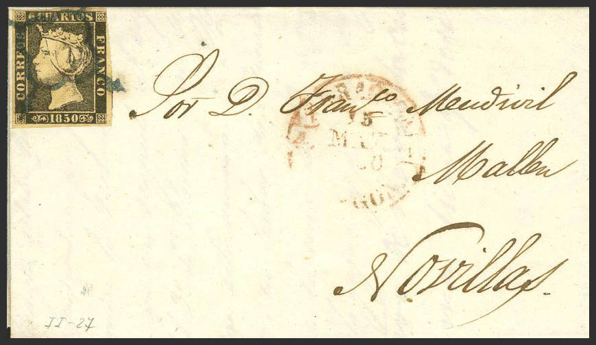 1A. 1850. 6- cuartos black. ZARAGOZA to HEIFERS. SPIDER postmark, in blue. MAGNIFICENT.