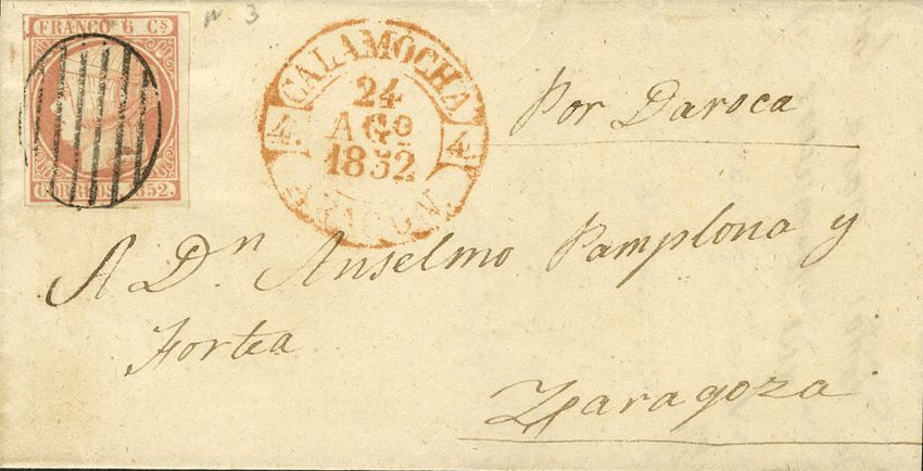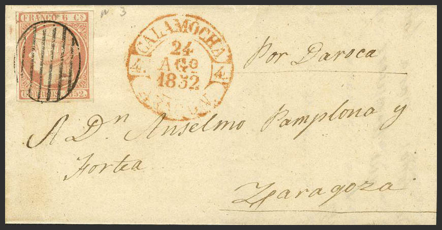 12. 1852. 6 cuartos pink. ALBARRACIN to ZARAGOZA. Postmark GRILL, on the front CALAMOCHA / ARAGON. MAGNIFICENT.