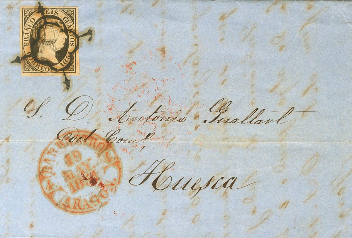 |ABOUT| 6. 1851. 6 black quarters. BARBASTRO to HUEUncirculatedA. On the Baeza front BARBASTRO / ARAGON, in red. MAGNIFICENT.