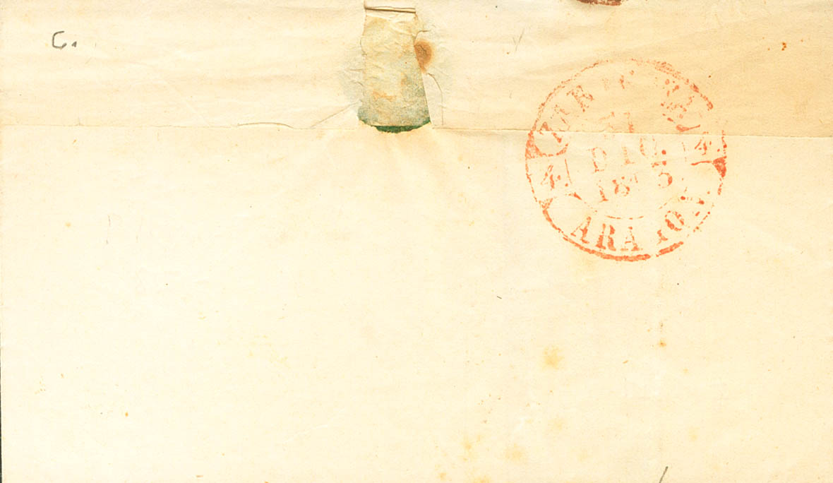 |ABOUT| 17. 1853. 6 carmine quarters. CASPE to ZARAGOZA. On the Baeza CASPE / ARAGON front, in red. NICE.